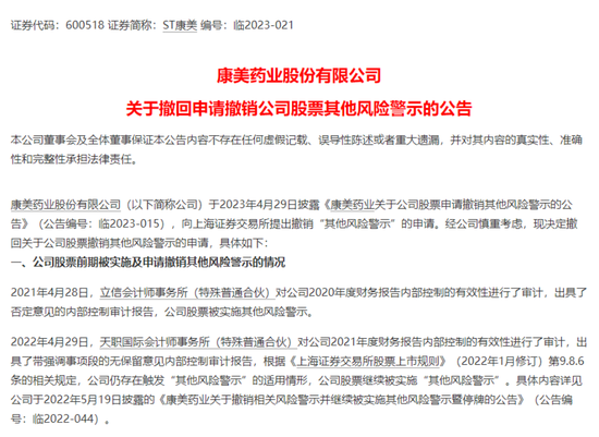 此前“作秀”股ST康好意思,又突遭利空。,ST康好意思6月13日晚间公告称,公司豪放关联澌灭其他风险警示的基本条目,经过审慎评估,从保护投资者利益、充分揭示后续省略情趣风险的角度起程,决定裁撤公司股票澌灭其他风险警示的恳求。