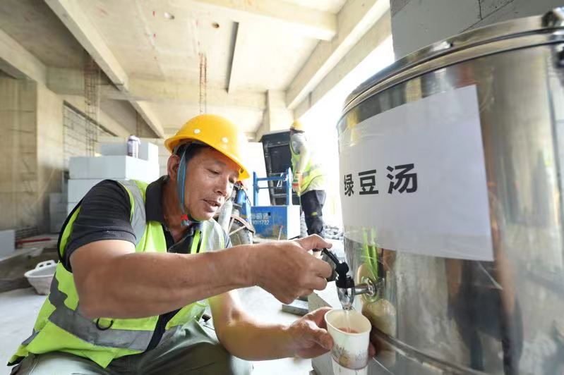 建筑工东说念主在河北工程大学附属病院恢复院区技俩施工现场饮用绿豆汤。新华社记者 赵鸿宇 摄