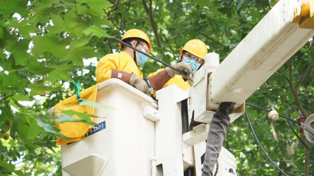 邯郸市供电公司职责主说念主员在进行带电功课。新华社记者 赵鸿宇 摄